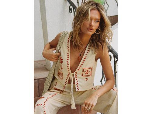 V neckline vest top Embroidered detail, tie closure with tassels Non-stretch material, fully lined 70% cotton 30% linen Cold gentle machine wash