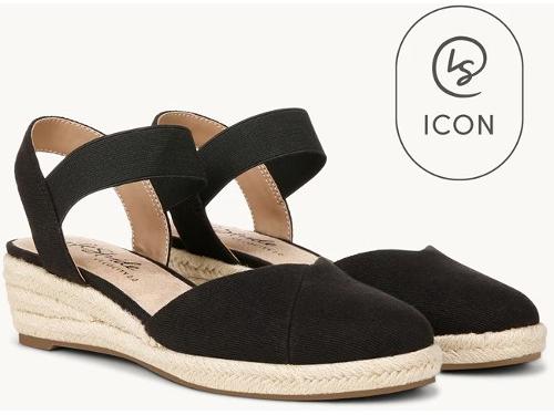 Subtle stripes on the elastic ankle strap give a nautical feel to these ultra comfortable knit womens sandals. Fabric upper with soft stretch gore strap at the ankle almond toe slip-on fit and espadrille-wrapped wedge. Linings toe box and heel counter partially crafted with recycled materials. Soft System® comfort package provides all-day support flex and cushioning Get next-level comfort with Velocity 2.0® featuring luxe linings superior cushioning and a premium insole with shock absorption & pressure distribution Traction sole provides you with extra stability Just Right Height 1.75 in espadrille wedge heel Life Stride Shoes Kimmie Espadrille Wedge Sandals (Black Canvas) Fabric 8.5 W