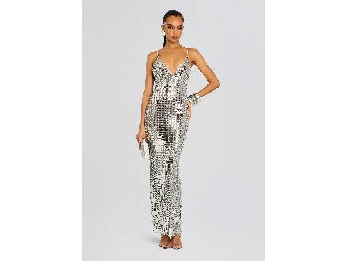 Our Perri Dress shimmers with elegance, ensuring you're the center of attraction. This breathtaking gown features a radiant finish, a plunging neckline that commands attention, and a body-con silhouette that flatters your every curve. Shown here in Silver. HANDMADE Mirrored plexi embellishments and hand-stitched crystals 100% Nylon Made in India Model is 5ft10in wearing size S Style No. SS24-8887