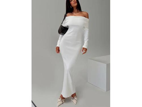 Maxi dress Off-shoulder style, ribbed material, folded detail at bust, relaxed fitting, straight cut hem Good stretch, unlined 52% acrylic 28% nylon 20% polyester Cold hand wash