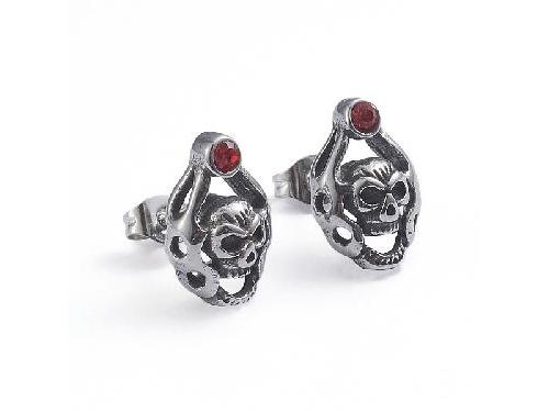 Retro 304 Stainless Steel Stud Earrings, with Cubic Zirconia and Ear Nuts, Skull, Red, Antique SilverSize: about 9.8mm wide, 14.5mm long; pin: 0.6mm.