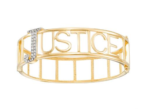 18kt Yellow Gold and Platinum Over Sterling Silver Justice Crystal Nameplate Bangle, Size 7 jewelry-0228202616149 User Information Avoiding Scams