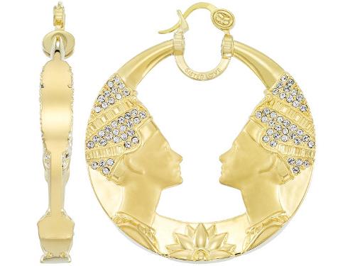 18kt Yellow Gold Over Sterling Silver Sculpted Nefertiti Hoop Earring, Frosted with Swarovski Crystals. Satin Finished and High Polished by Hand. Infused with a Patented Diamond Resin to Make Earrings Dent Resistant.