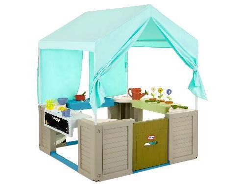 The Little Tikes Backyard Bungalow Playhouse is the perfect outdoor retreat for toddlers and kids aged 2 and up. Designed to inspire endless imaginative play, this spacious playhouse features three exciting roleplay stations: a kitchenette with a pretend stove and sink, a lemonade stand with a real chalkboard, and a gardening station with make-believe flowers. With a working door, mailbox slot, and over 25 fun accessories, kids can enjoy hours of creative play. The canopy that opens and closes adds a charming touch, making this playhouse a versatile and engaging space for multiple children to play together. Let your little ones dream big and create lasting memories with the Backyard Bungalow Playhouse!