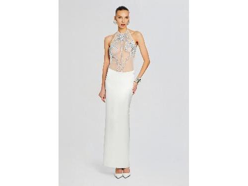 Step into elegance and sophistication with our Meridian Dress, featuring a sheer top adorned with palm tree embellishments for a touch of tropical glamour. With its sleek silhouette and open back design, this gown exudes modern sophistication. Shown here in White. HANDMADE Hand-stitched beaded embellishments 30% Nylon, 50% Acetate, 20% Polyester Made in India Model is 5ft11in wearing size S Style No. SS24-8997