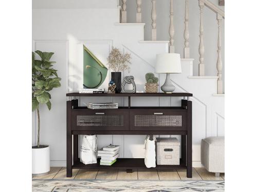 Let the sleek form and sophisticated style of the Tayler collection console table elevate your entryway or living room! Its rich espresso-brown finish is complemented by acrylic-faced drawers with chrome handles that hide items and keep your home looking tidy. Two open shelves and one spacious lower shelf make perfect spots for decor, storage baskets, and other essentials. Available for Online Purchase Only. Ships Directly from the Manufacturer. RC Willey Delivery is Not Available. Assembly required. Top is formed by wood veneer that has a density and hardness resistant to every day wear and tear. Textured acrylic window panels Three (3) open-back shelves Espresso brown finish