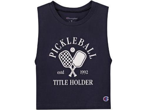 ON OR OFF THE COURT Hit the pickleball court in this graphic crop top for women, offering a trendy look whether you're playing a match or just chilling out. Made from a soft cotton blend, it sports a modern crewneck and a narrow shoulder cut, offering a comfortable fit that is great for wearing alone or under your best zip-up hoodie from Champion. Marked with the mini C logo patch around the hem, this cropped shirt is the perfect fit for summer.