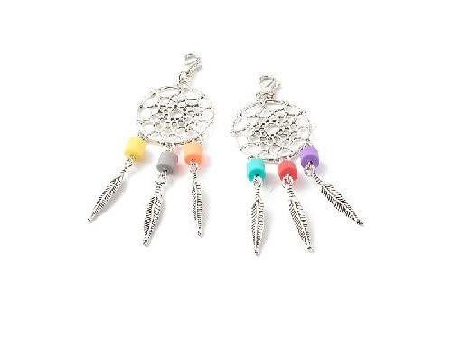 Tibetan Style Alloy Big Pendants, Woven Net/Web with Feather & Handmade Polymer Clay Beads, with Lobster Claw Clasps, ColorfulSize: about 3.35 inch(85mm) long, 1.10 inch(28mm) wide, beads: 0.24x0.24 inch(6x6mm).