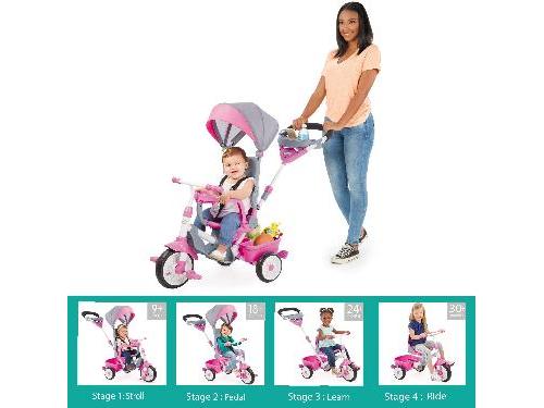 The Perfect Fit 4-in-1 Trike in pink grows with your child! First, the parent pushes and steers; but, as the child grows, the parent steers while the child pedals. When toddlers learn to pedal, you can remove the waist bar and now they can steer. Last stage is when the child pedals and steers all by themselves!