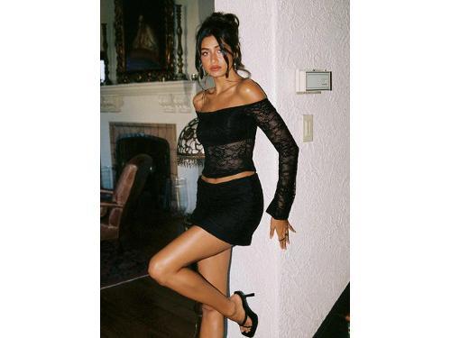 Lace mini skirt Ruched, split hem with ruffle detail, elasticated waistband Non-stretch material, fully lined Main: 80% nylon 10% elastane, Lining: 95% polyester 5% elastane Cold gentle machine wash
