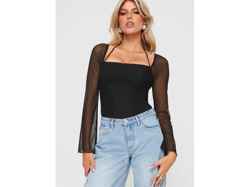 Long sleeve bodysuit Sheer sleeve, halter neck tie fastening, square neckline, cheeky cut bottom, press clip fastening Good stretch, partially lined Princess Polly Lower Impact 90% reclaimed polyester 10% elastane Cold gentle machine wash