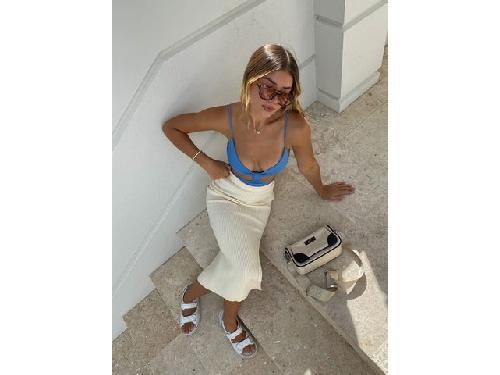 Midi skirt High waisted fit 50% viscose 28% polyester 22% nylon Length of size S/M waist to hem: 86cm / 33.8in Maria is wearing a size XS/S Emma-Leigh is wearing a size XS/S @dekota_thompson is wearing a size XS/S Split at side Knit material Ribbed design Elasticated waistband Unlined
