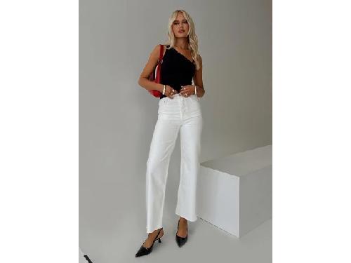 Jeans White washed denim, high rise fitting, belt looped waist, classic five pocket design, zip & button fastening, branded patch at back, straight leg, raw edge hem Non-stretch, unlined 100% cotton Cold machine wash