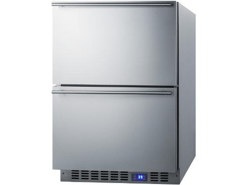 Summits outdoor collection of stainless steel drawer refrigerators brings luxury style, quality construction, and user convenience to any outdoor kitchen. Sized with a convenient 24in footprint, it can be built under counters or used freestanding. The cabinet and drawers are constructed from weatherproof stainless steel, with sleek handles to complete the look. An integrated Ground Fault Circuit Interrupter helps to protect the unit in the event of circuit breaks and the sealed back adds extra protection from the elements. We include an anti-tip bracket (installed by the user) for added safety. Two sliding drawers offer convenient storage inside the 3.4 cu. ft. auto defrost interior, with fan-forced cooling to ensure even temperature distribution. The drawers are fully constructed from stainless steel for easy cleaning and long-lasting use. Inside, a full-width sliding wire basket offers easy storage, while two adjustable dividers let you organize both the top and bottom drawer by separating the interior to accommodate a variety of items. Recessed LED lighting offers an attractive yet energy-efficient look inside. The digital thermostat located in the stainless steel kickplate offers a readout in Celsius or Fahrenheit. Additional features include a Sabbath mode setting, temperature memory function, audible alarms for high-temperature fluctuations, and open drawer alerts. The SPR627OS2D can be used in home or commercial settings. This unit is ETL-S listed to NSF-7 standards and meets UL Commercial Standard 471. For a matching frost-free freezer, see the SPFF51OS2D. 4.26 cu.ft. Automatic-Defrost Operation Sabbath Mode Sound Level: 32.9 d B
