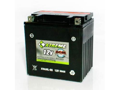 This Xtreme high-performance 30L-BS AGM powersport battery can be used in a variety of powersport machines like motorcycles, ATVs, snowmobiles and more.;Provides a powerful 385 cold cranking amps and incorporating a special alloy to minimize self-discharge while optimizing initial cranking power.;The AGM design offers exceptional resistance to vibrations and can withstand a wide range of temperatures, making it ideal for extended outdoor adventures.;Filled and activated at the store. It's ready to use in a few hours after you charge and install your new battery in your motorcycle, ATV or personal watercraft.;Extreme's advanced AGM design is 100% spill-proof and maintenance free to prevent electrolyte leakage and reduce corrosion buildup on terminals and surrounding areas.;Comes with a 12 Month Free Replacement Limited Warranty.