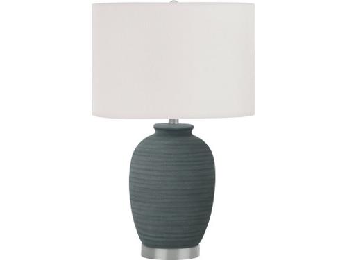 This fashionably versatile 24-in table lamp is the perfect way to brighten up any room in your home or office! With its contemporary design in a blue ceramic textured base atop a silver metal foot and a cream fabric drum shade, finished with a round silver finial on top, this stylish lamp adds flair to an end or side table, nightstand, or bedside table. Featuring a 3-way switch housing a single bulb with a maximum output of 100W/120V (not included), this ceramic accent lamp will illuminate any space in your living room, bedroom, or office. Made with durable quality materials ensuring longevity, this lamp includes a 2-year limited warranty against any manufacturer's defects for a worry-free purchase. Available for Online Purchase Only. Ships Directly from the Manufacturer. RC Willey Delivery is Not Available. Assembly required. Illuminate your space with this stylish and versatile 24 in table lamp featuring a textured finish base in a blue ceramic hue with a sleek silver metal footing, a drum shaped ivory fabric shade and finished with a round, silver finial on top. The convenient 3-way rotary switch using a maximum outage of 100W/120V (bulb not included), allows you to adjust the lighting ambiance and brighten up your office, living room or bedroom Attached with a transparent 6ft cord, this contemporary designed, decorative accent lamp adds a warm and inviting atmosphere when placed on an end or side table or nightstand as an added lighting option. Minor assembly is required with illustrated instructions included; confidently designed using durable materials, this lamp is backed with 2-year limited warranty against manufacturer's defects for your satisfaction.