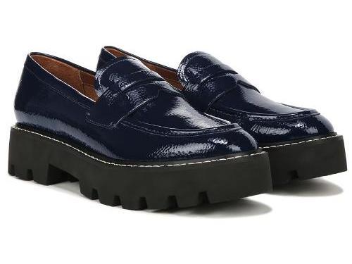 Luxe lug sole loafers. These casual womens shoes are coveted for craft comfort and chic style.Crinkle patent upper fabric calf hair or faux leather upper partially made from recycled materials Partially recycled linings with soft + eco-conscious comfort Slip on fit for easy on/off Round toe Penny keeper strap1.5 in heel with 1.25 in platform lug sole Franco Sarto Franco Balin Lug Sole Penny Loafer (Midnight Patent Leather) 7.0 M Slip On Fit, Round Toe, Slip-On Fit, Platform Heels