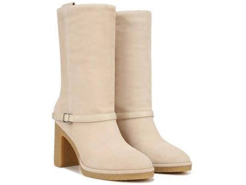 Casual womens boots with an irresistible pull. Chic detailing high heels and Inspired Italian Design make them a must-have for fall.Leather and synthetic leather upper partially made from recycled materials Partially recycled linings with soft + eco-conscious comfort Pull on fit Round toe Wraparound strap with buckle and dual pull-tab details8.07 in shaft height 11.42 in circumference Note: Measurements based on size 6 boot. For each half size up from a 6 shaft height increases by.12 in circumference by.20 in3.5 in block heel with gum outsole Franco Sarto Franco Paxton Mid Calf Boot (Ecru White Suede) 8.0 M Round Toe
